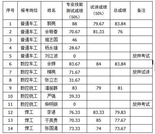 按照《九江学院2025年面向社会公开招聘金工实习指导教师公告》的要求,对报名人员进行了资格审查,并组织符合条件的人员进行了专业技能测试和试讲。专业技能测试成绩合格分数线为70分。根据专业技能测试成绩,从高分到低分按岗位招聘计划人数3:1的比例确定入围试讲人员(如遇末位同分情况,一并入围试讲)。对合格人数未达到3:1比例的岗位,该岗位专业技能测试成绩70分及以上者全部入围试讲。试讲成绩合格分数线为70分,试讲成绩不合格则不予聘用。现将考试成绩公示如下:
