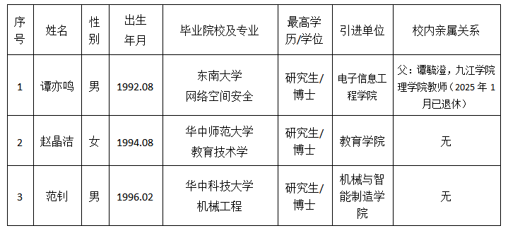 根据《九江学院人才引进实施办法(修订)》的要求,谭亦鸣等三人已通过报名、试讲等程序。经学校研究,拟作为我校高层次人才引进,现予以公示。
